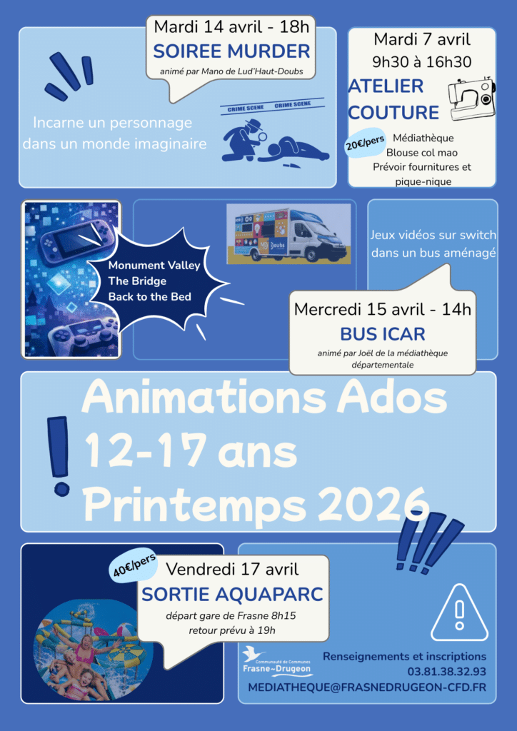 Vous trouverez ci-joint les animations proposées par Mariève BONNET, animatrice jeunesse à la CFD pour les ados (12-17 ans), pendant les vacances scolaires d’avril.