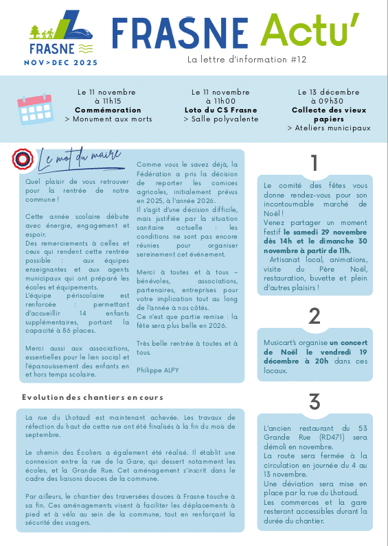 Vous pouvez télécharger le Frasne actu, nouveau bulletin de la mairie à compter de 2024 !